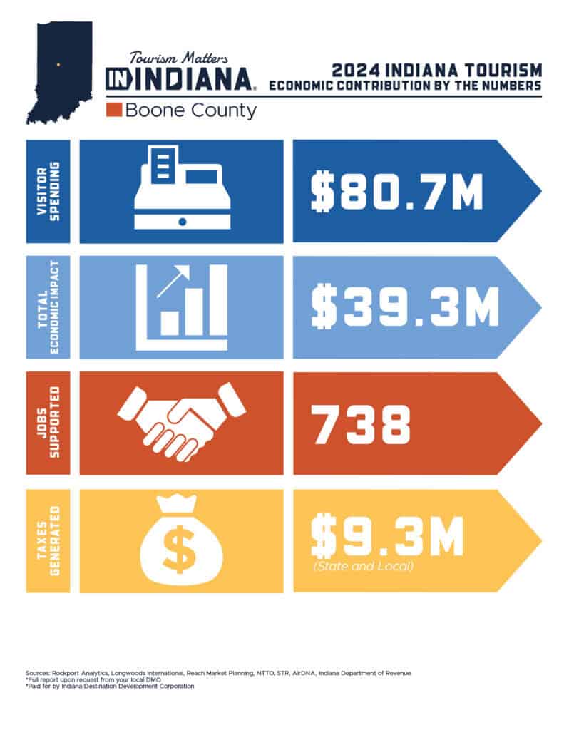 The following information is drawn from a 2024 report by Rockport Analytics commissioned by the Indiana Destination Development Corporation and highlights how visitor spending strengthens Boone County’s economy, workforce, and community.