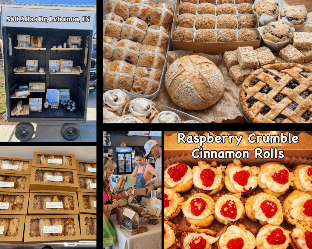 They sell Sourdough breads (plain, Italian herb & cheese, chocolate, jalapeño cheddar, seasonal), sourdough English muffins, sourdough croissants, sandwich bread loads, fruit pies, jam, fresh milled flower, tallow skin care, goats milk soap, seasoning blends, brioche rolls, homemade Chex mix, French cinnamon sugar puffs, cinnamon rolls, cakes, rice crispy treats, muffins, cookie decorating kits, cookies, fresh seasonal produce, beauty products (tallow, balm), homemade seasonings.