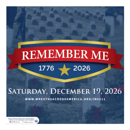 On December 19, 2026, at 12:00 pm, IN0211 – Boone County Extension Homemakers will be hosting a wreath ceremony at Memorial Park in Lebanon, IN to Remember and Honor our veterans.
