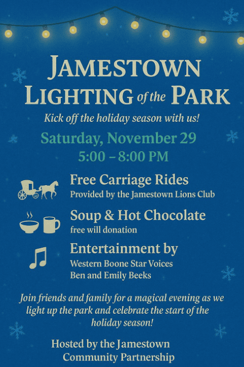 Join friends and family for a magical evening as we light up the park and celebrate the start of the holiday season! Hosted by Jamestown Community Partnership. We will have free carriage rides (provided by Jamestown Lions Club), Soup (potato, chili, & Chicken noodle) and hot chocolate with a free will donation, and entertainment by: Western Boone Star Voices and Ben and Emily Beeks.