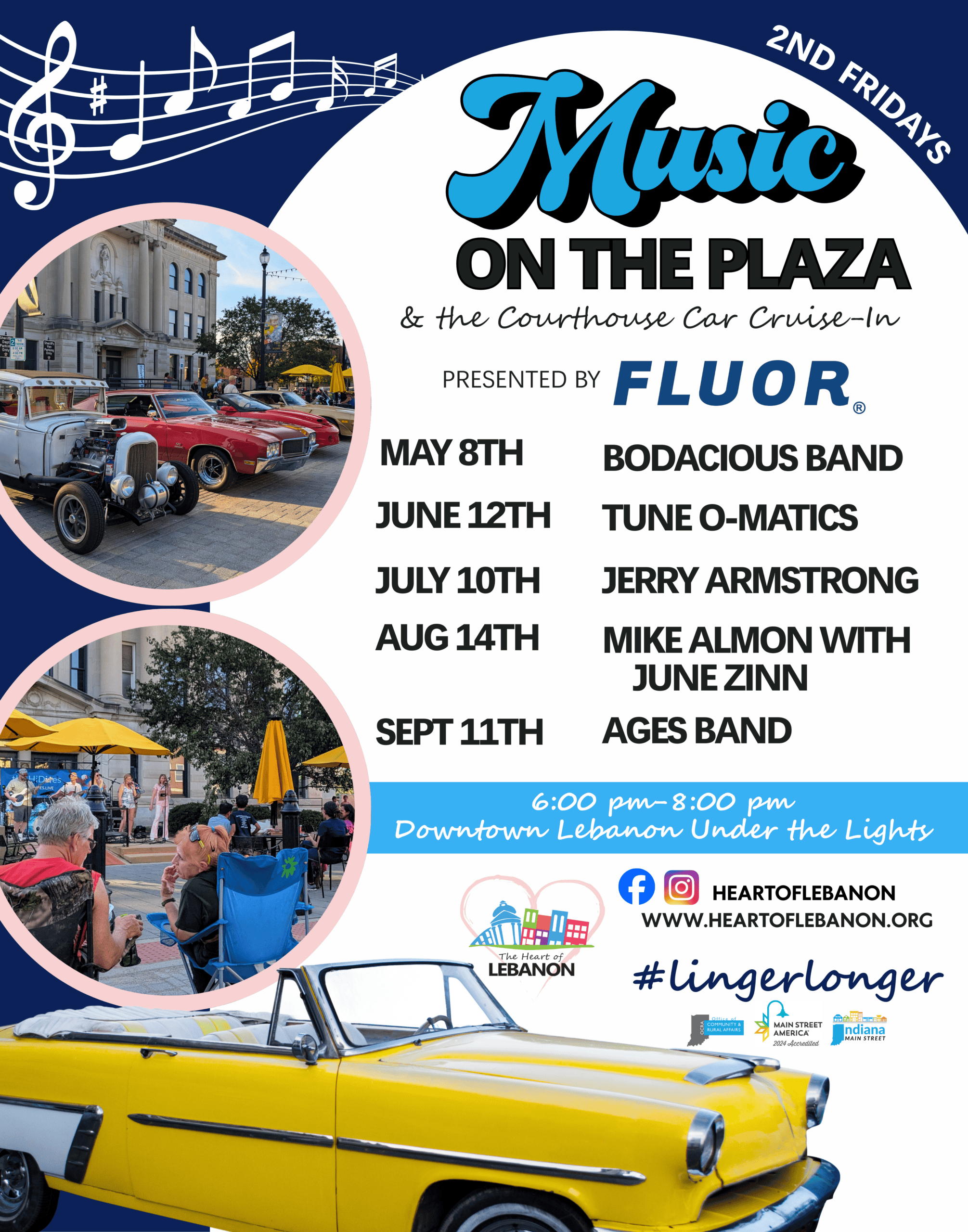Music on the Plaza is a FREE lively community event that brings music and classic cars to the heart of downtown. Enjoy live music while admiring the stunning lineup of cars at the Lebanon Courthouse Car Cruise-In. Bring a chair and gather with friends and family for a fun-filled evening of great music, beautiful cars, and a vibrant downtown atmosphere!