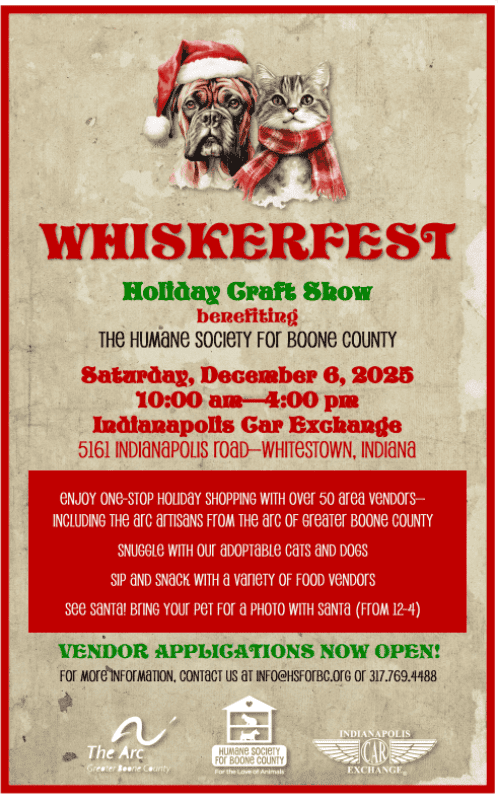 Get into the holiday spirit at Whiskerfest, our annual Holiday Craft Show benefiting the Humane Society for Boone County! This fun-filled event is the perfect place for one-stop holiday shopping, featuring over 50 vendors with unique gifts, crafts, and seasonal goodies.
