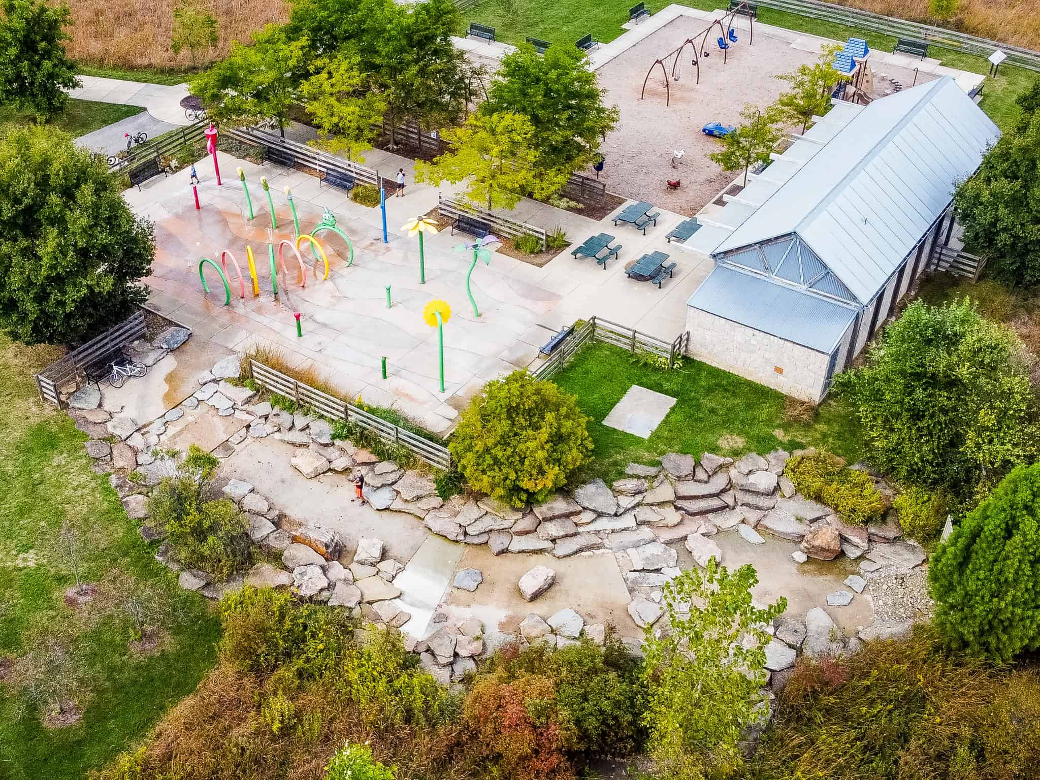 Mulberry Fields is a 38-acre community park easily accessible from the Big-4 Rail Trail. The park features a variety of amenities including a splash pad, a creek play area, a large skate park, athletic fields, basketball courts, and four pickleball courts. Visitors can also enjoy a traditional playground, picnic shelters, restrooms, and a sledding hill that doubles as a scenic overlook. Native prairie plantings and signage provide educational opportunities and a connection to the local landscape.